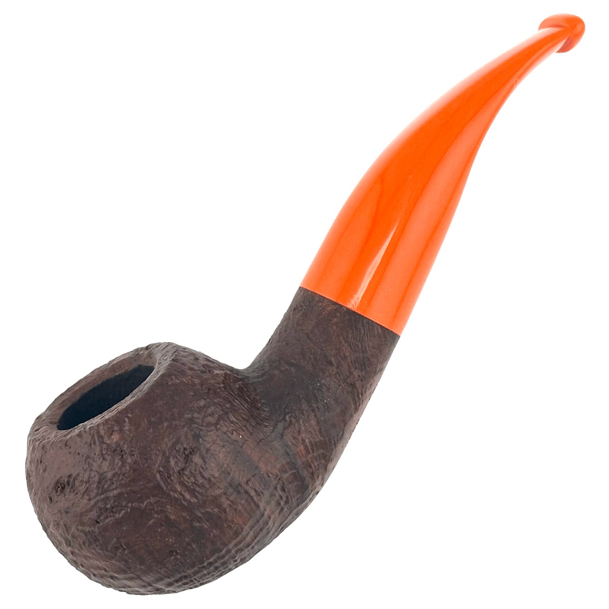 Erik Stokkebye’s 4th Generation Fathers, Friends and Fire 2025 Sandblast celebrates fathers worldwide with a limited-edition pipe release. This year’s model features a gracefully bent Apple design, crafted for balance and elegance. The bowl is robust and rounded, rising smoothly from the heel to a refined flat rim. A precise, angled transition leads to a thick, upturned shank, complemented by a gently tapered, arched stem that enhances the overall profile. Finished in a rich sandblast texture, the pipe is paired with a bold orange acrylic stem, creating a contemporary twist on a classic silhouette.