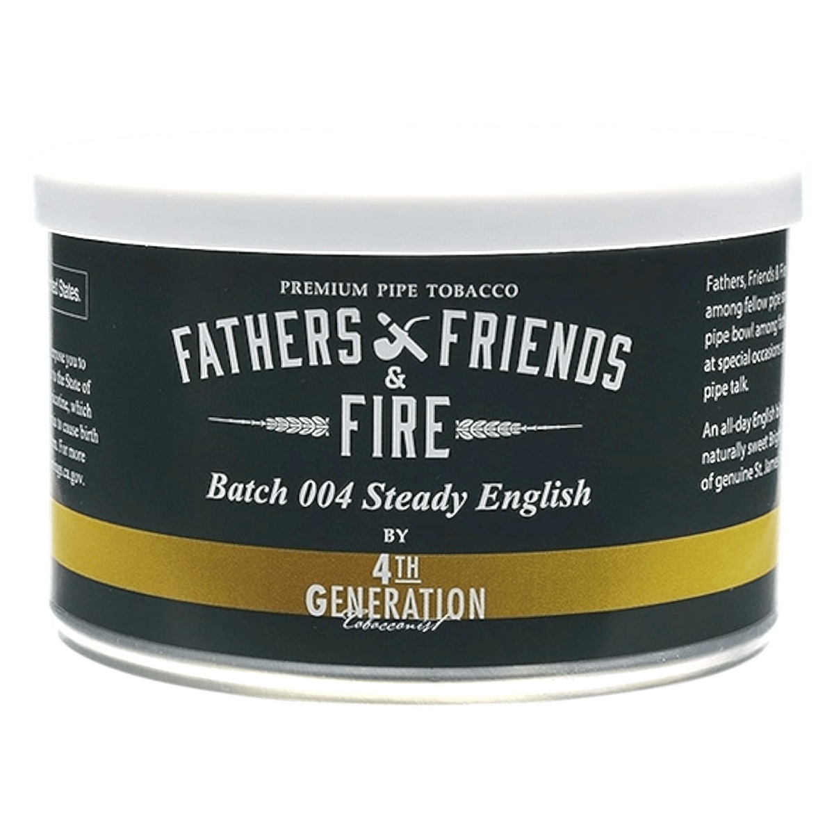 4th Generation Fathers, Friends & Fire Batch 004, Steady English offers a refined all-day smoke, crafted from rich Turkish Latakia, naturally sweet Bright Virginia, and a subtle touch of authentic St. James Perique.