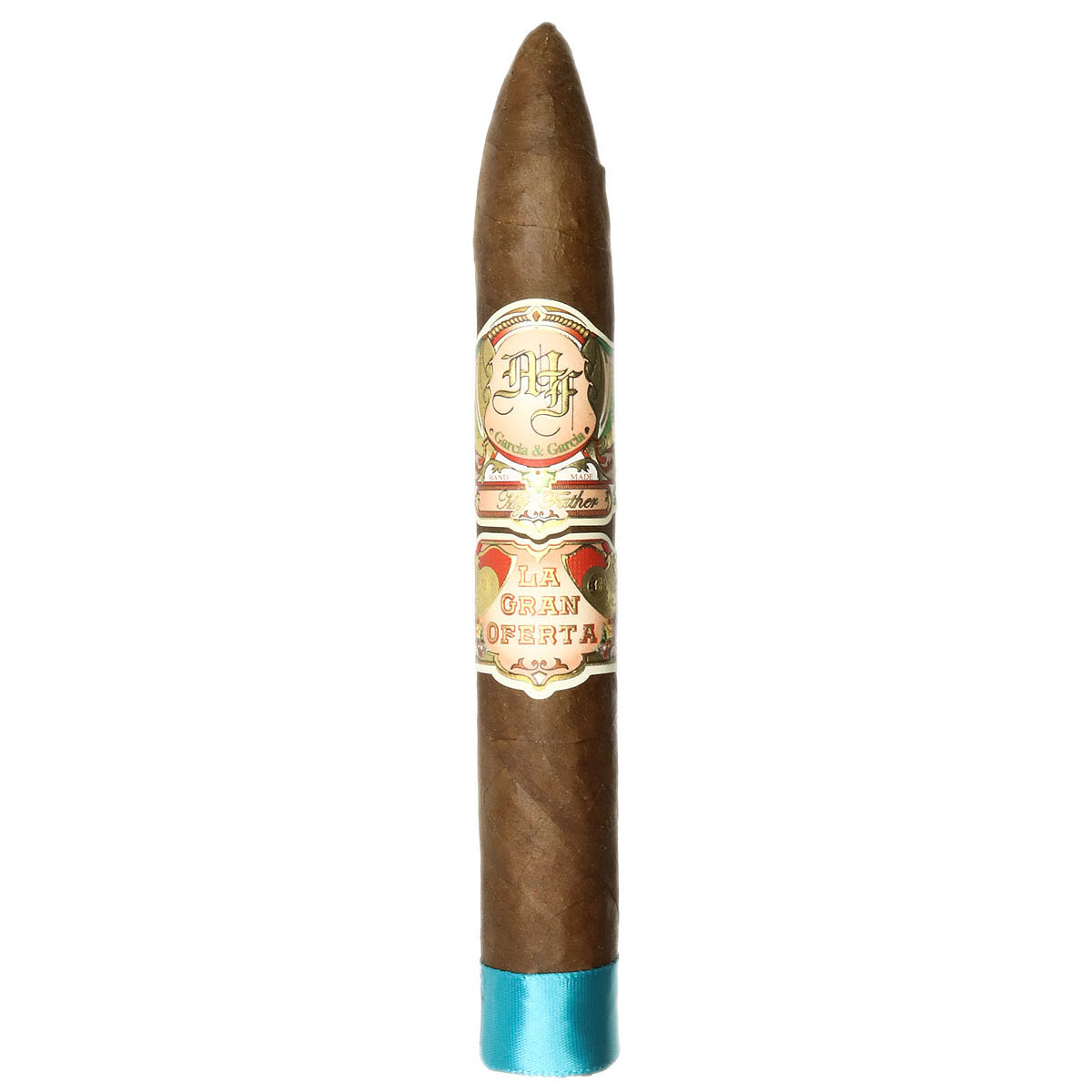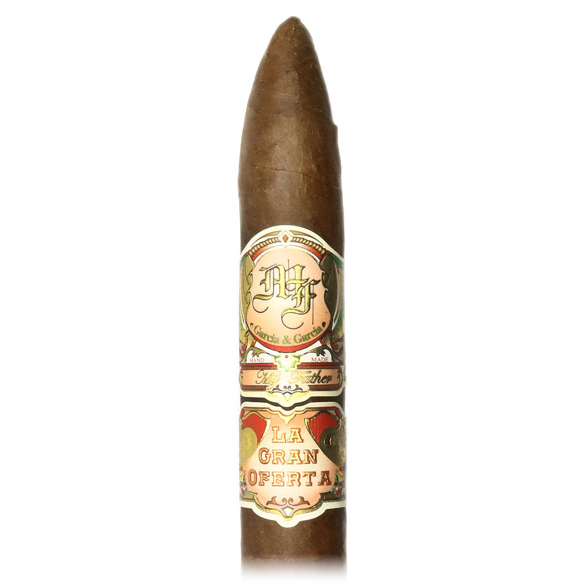 The My Father La Gran Oferta Torpedo (6.13″ x 52) is a regular-production handmade cigar from Jaime Garcia’s factory in Estelí, Nicaragua, reviving a vintage Cuban brand. It features an Ecuadorian Habano Rosado wrapper with Cuban-seed binder and Nicaraguan filler grown on the Garcia family’s farms. This medium-strength cigar comes in a stick package, is not box-pressed, and is not flavored. Measuring 6.13 inches in length with a 52 ring gauge, it is shaped in a torpedo format.