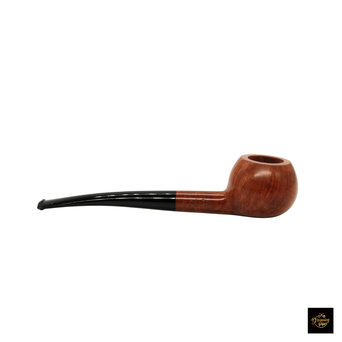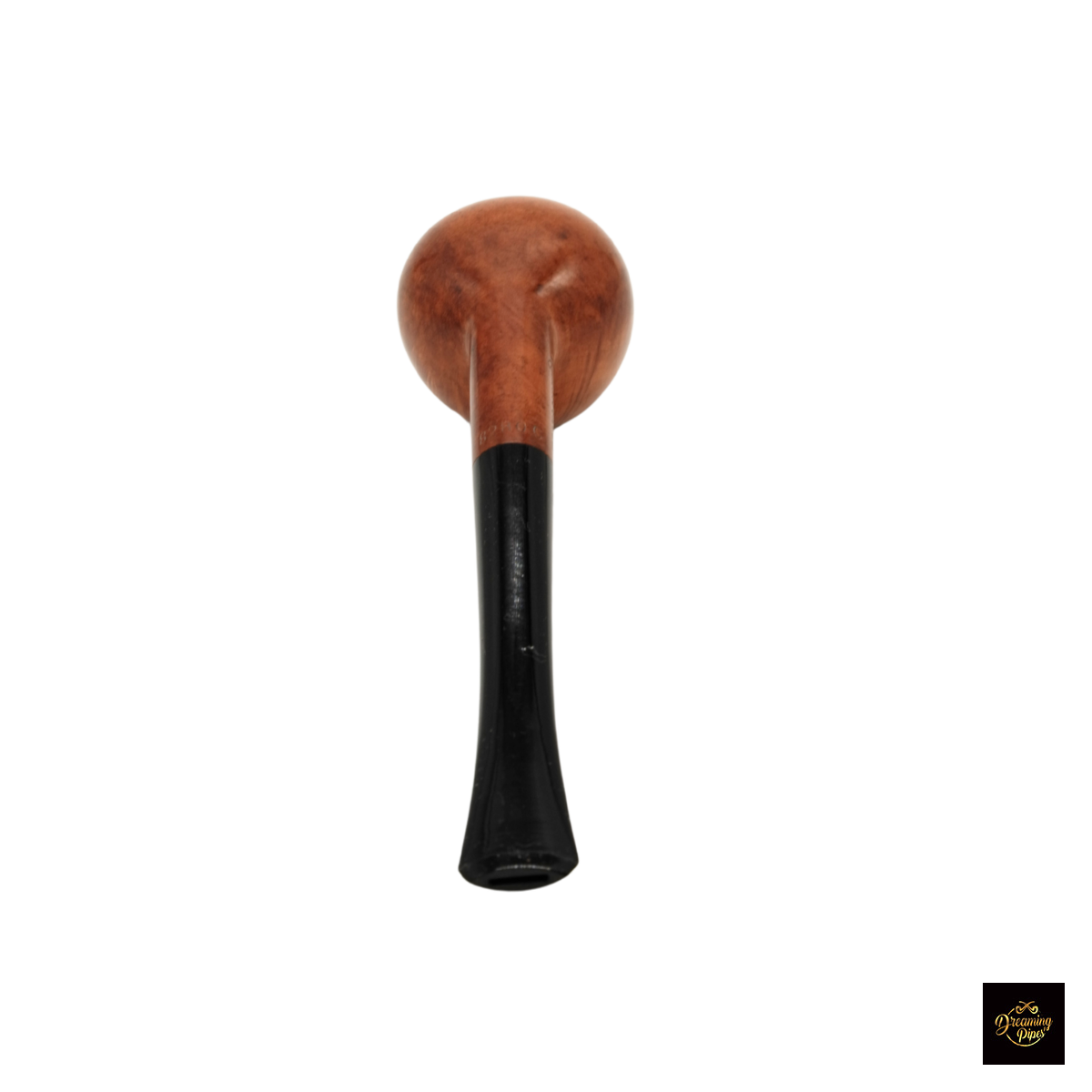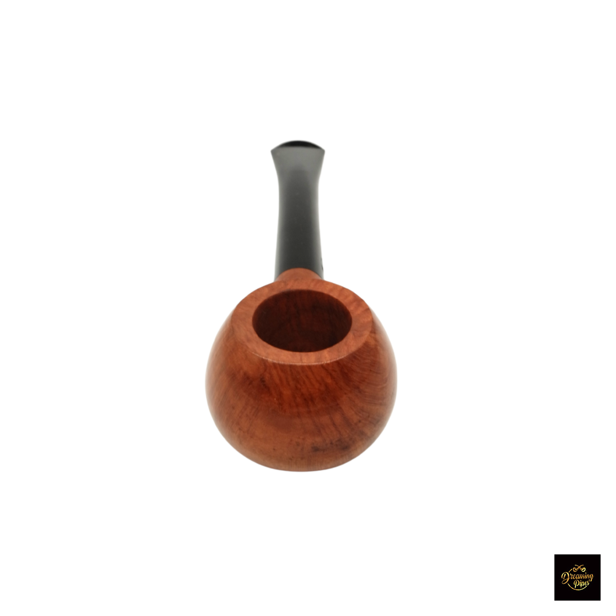 The bowl features a soft, rounded form with a smooth rim and attractive natural grain visible throughout the briar. Its medium-brown stain highlights subtle flame and birdseye patterns, giving the pipe depth and warmth while maintaining a polished, traditional look.