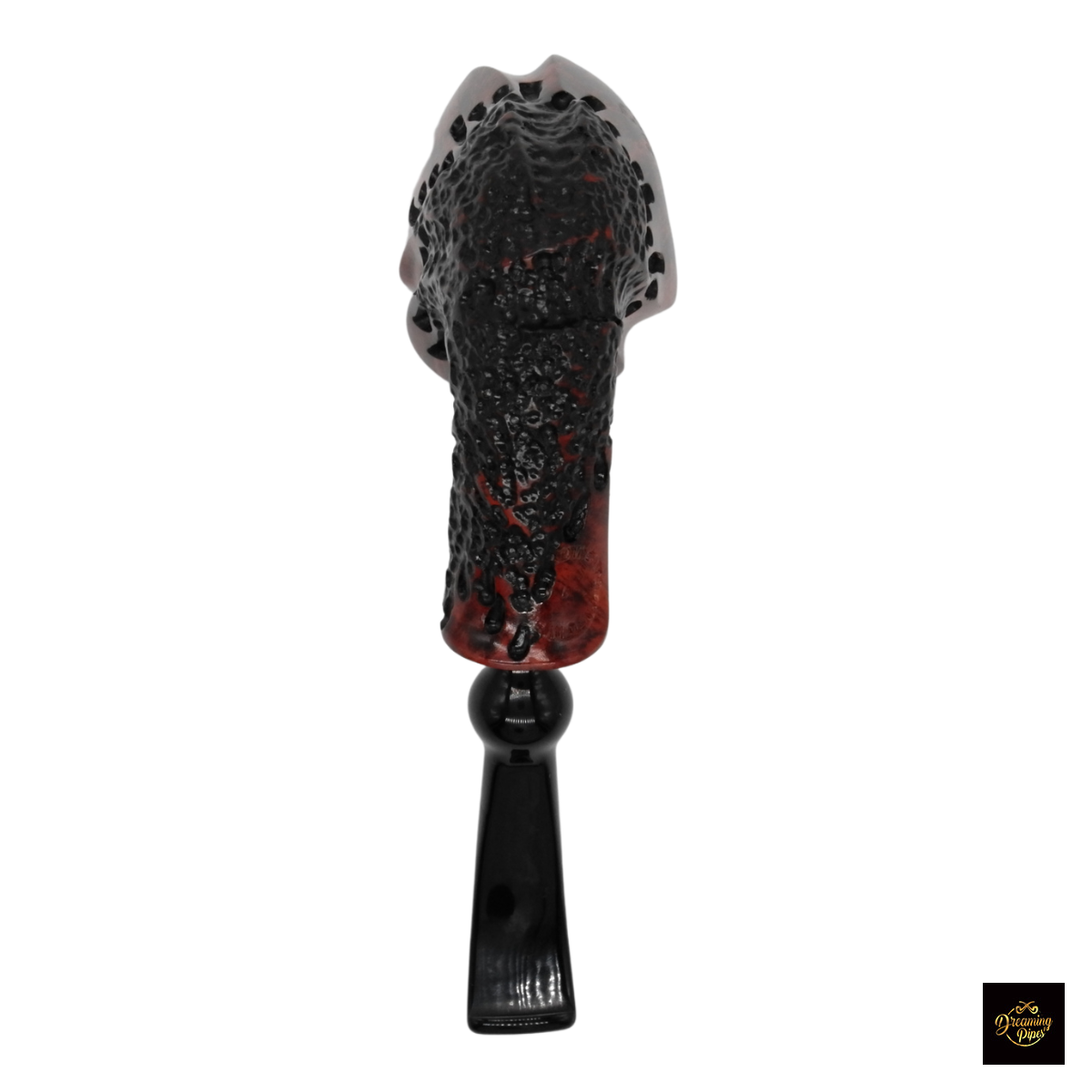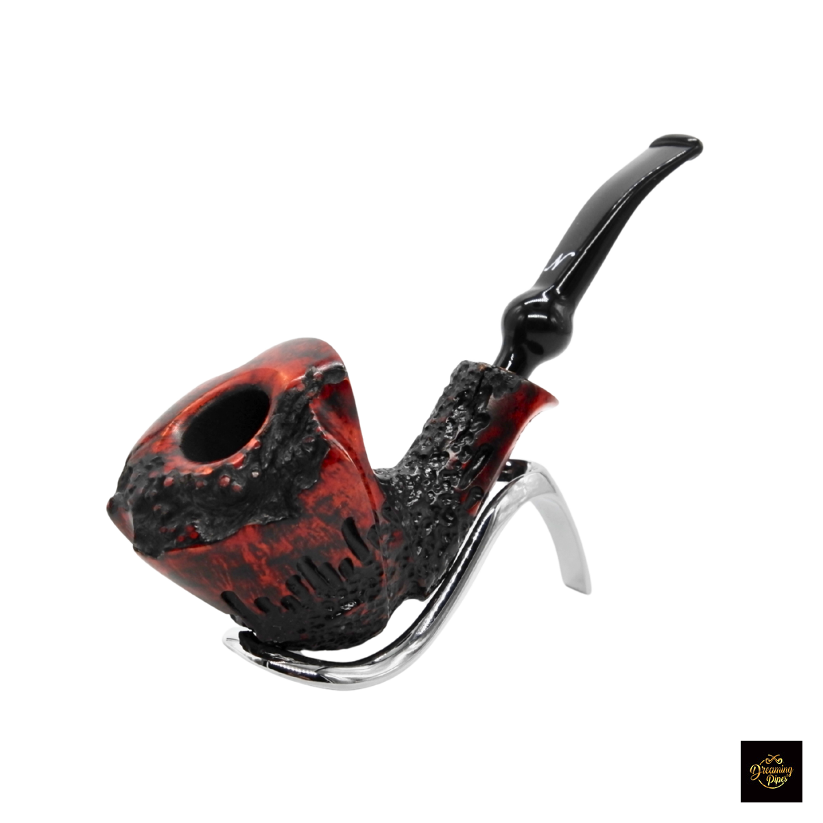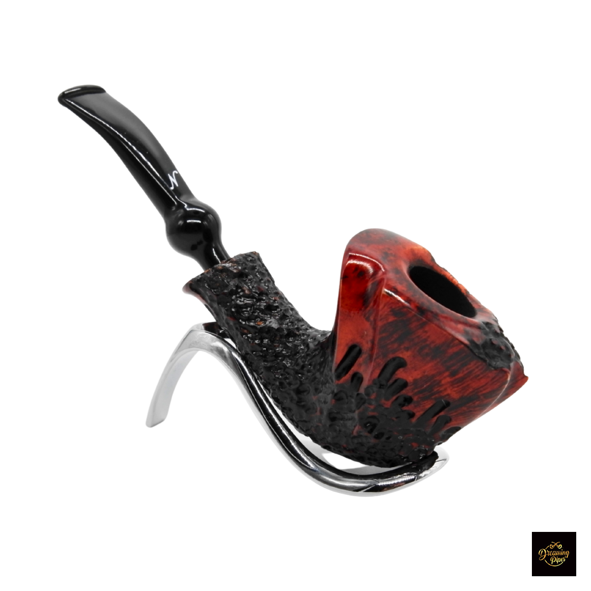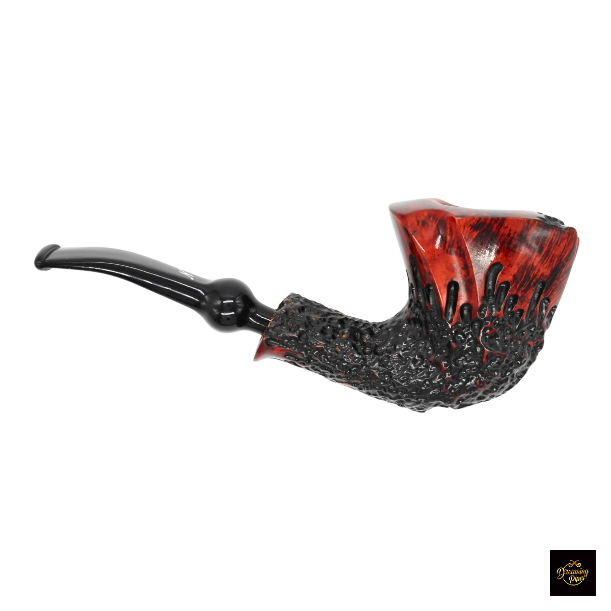 This striking piece features a dramatic two-tone red and black finish, where smooth flame-grained briar contrasts beautifully with deep, rugged rustication. The bowl rises with a slightly forward cant, giving the pipe a dynamic silhouette while highlighting the natural character of the briar.